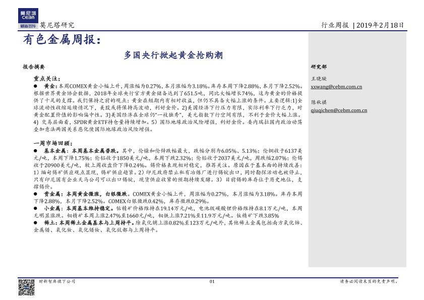 【莫尼塔研究】【20190218】20190218-莫尼塔投资-有色金属周报:多国央行掀起黄金抢购潮-16页