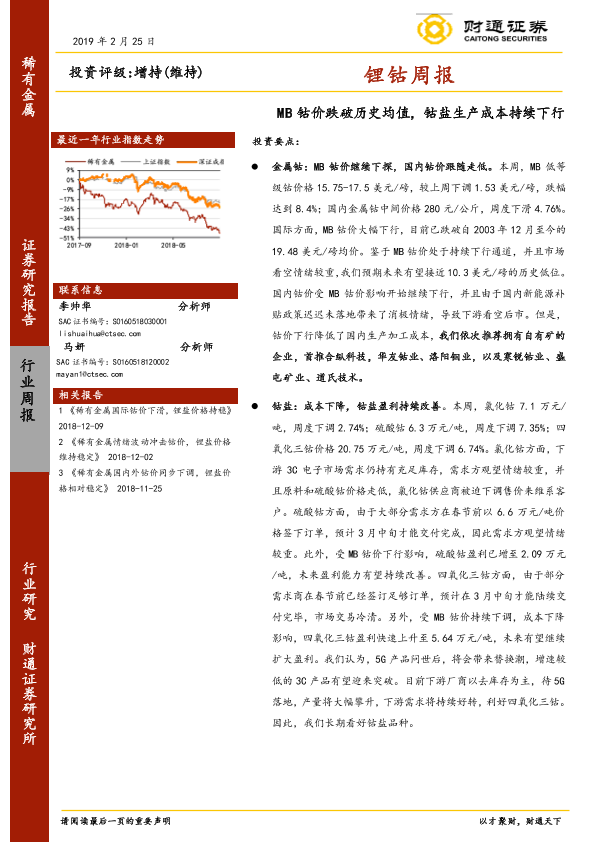 【财通证券】【20190225】20190225-财通证券-锂钴周报:MB钴价跌破历史均值,钴盐生产成本持续下行-12页