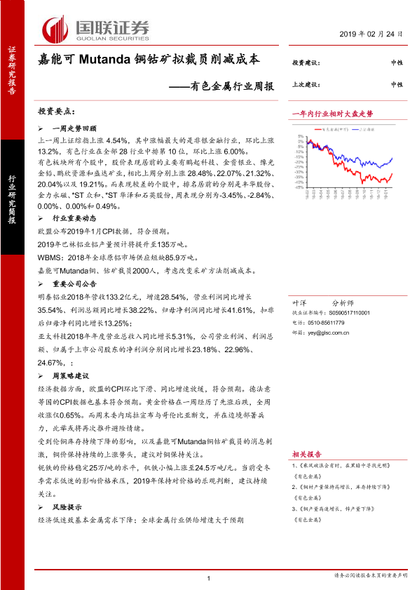 【国联证券】【20190224】国联证券-有色金属行业周报:嘉能可Mutanda铜钴矿拟裁员削减成本-11页