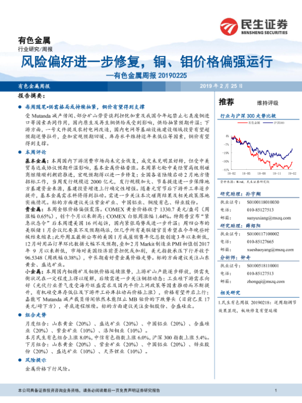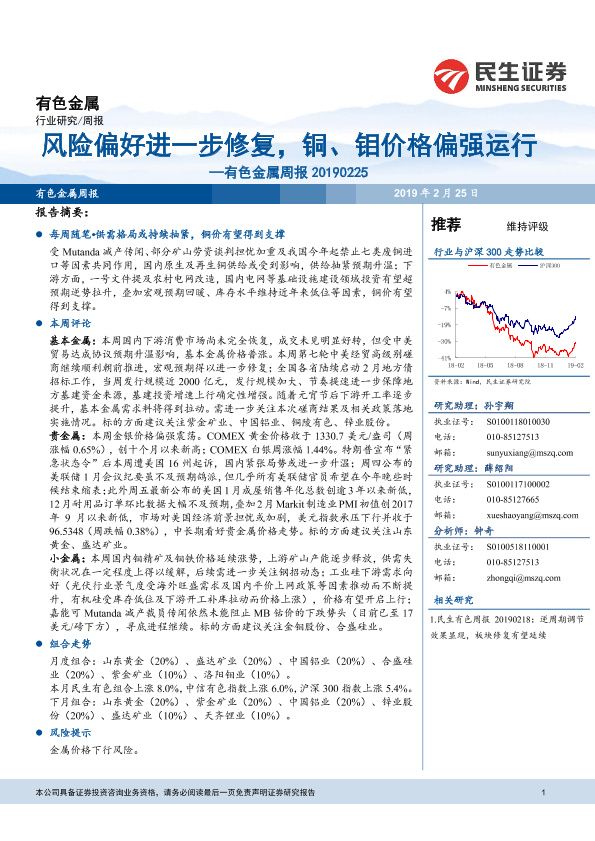 【民生证券】【20190225】20190225-民生证券-有色金属周报:风险偏好进一步修复,铜、钼价格偏强运行-39页