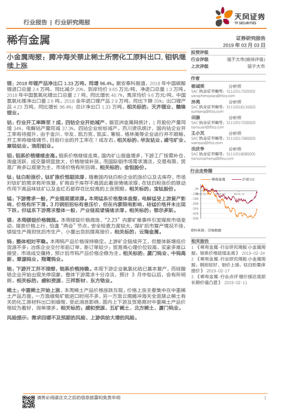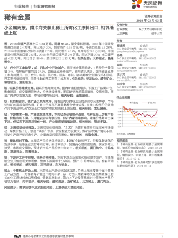 【天风证券】【20190303】20190303-天风证券-小金属周报:腾冲海关禁止稀土所需化工原料出口,钼钒继续上涨-16页