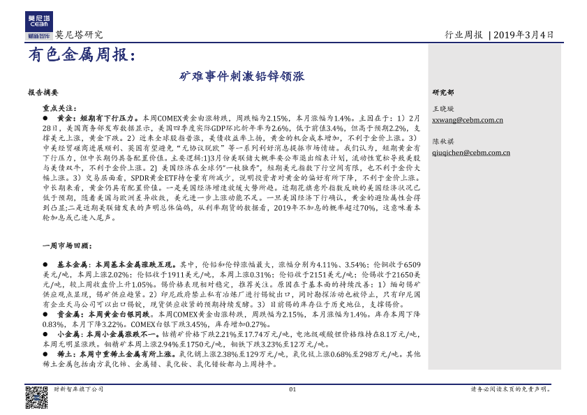 【莫尼塔研究】【20190304】20190304-莫尼塔投资-有色金属周报:矿难事件刺激铅锌领涨-16页