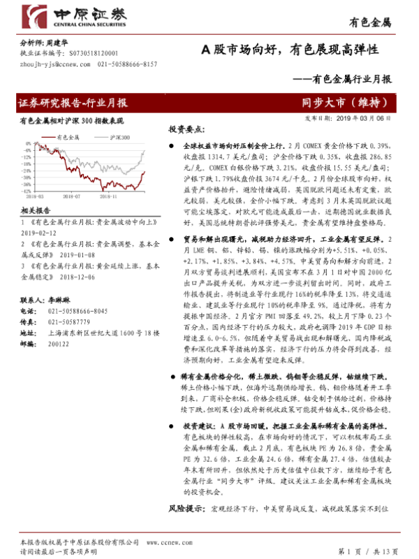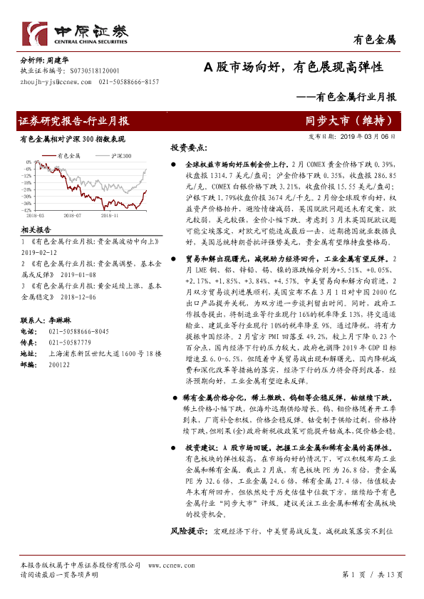 【中原证券】【20190306】A股市场向好,有色展现高弹性——有色金属行业月报-13页