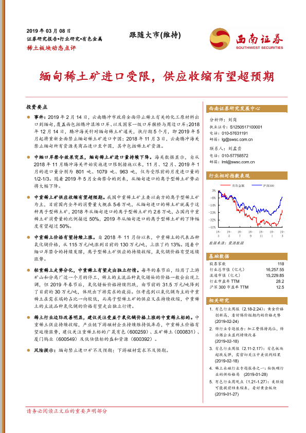 【西南证券】【20190308】稀土板块动态点评:缅甸稀土矿进口受限,供应收缩有望超预期-3页