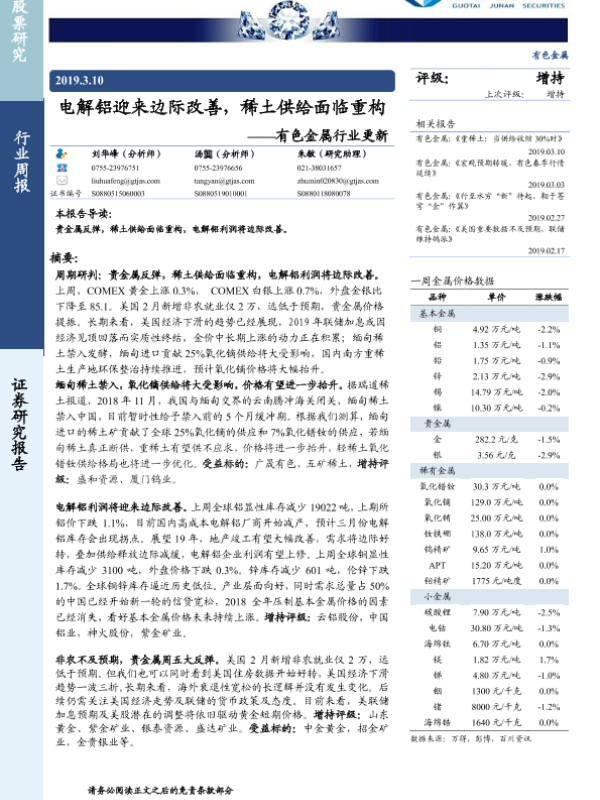【国泰君安证券】【20190310】20190310-国泰君安-有色金属行业更新:电解铝迎来边际改善,稀土供给面临重构-15页