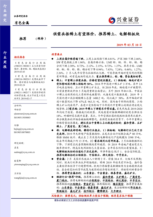 【兴业证券】【20190310】20190310-兴业证券-有色金属行业周报:供需共振稀土有望涨价,推荐稀土、电解铝板块-14页