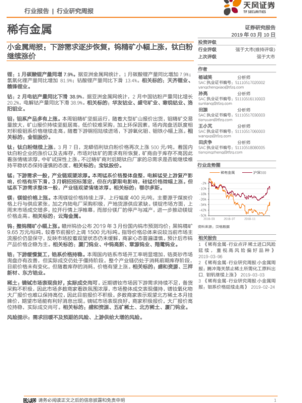 【天风证券】【20190310】20190310-天风证券-小金属周报:下游需求逐步恢复,钨精矿小幅上涨,钛白粉继续涨价-16页