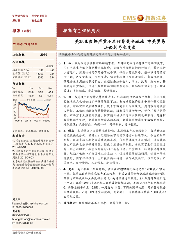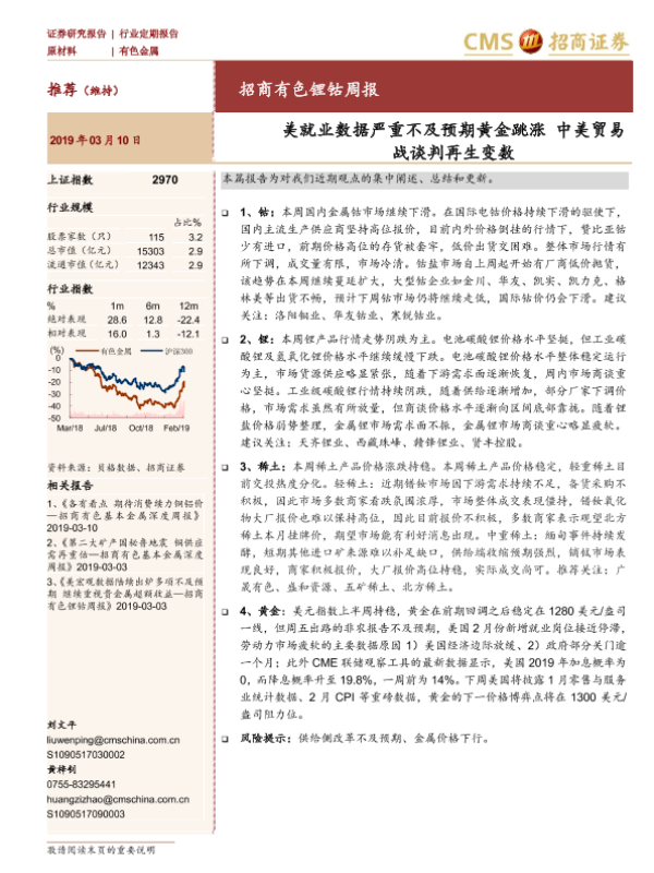【海通证券】【20190310】有色锂钴周报:美就业数据严重不及预期黄金跳涨 中美贸易战谈判再生变数-12页