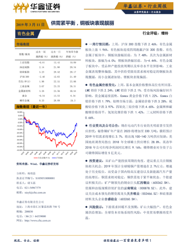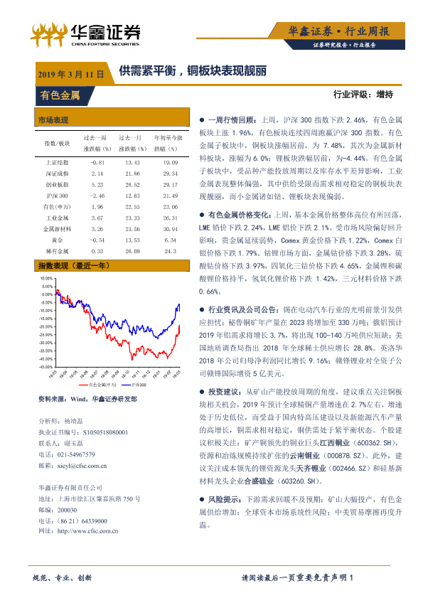 【华鑫证券】【20190311】20190311-华鑫证券-有色金属行业周报:供需紧平衡,铜板块表现靓丽-13页