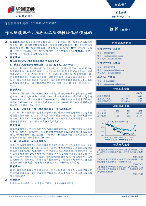 【华创证券】【20190317】20190317-华创证券-有色金属行业周报:稀土继续涨价,推荐加工及锂板块低估值标的-23页