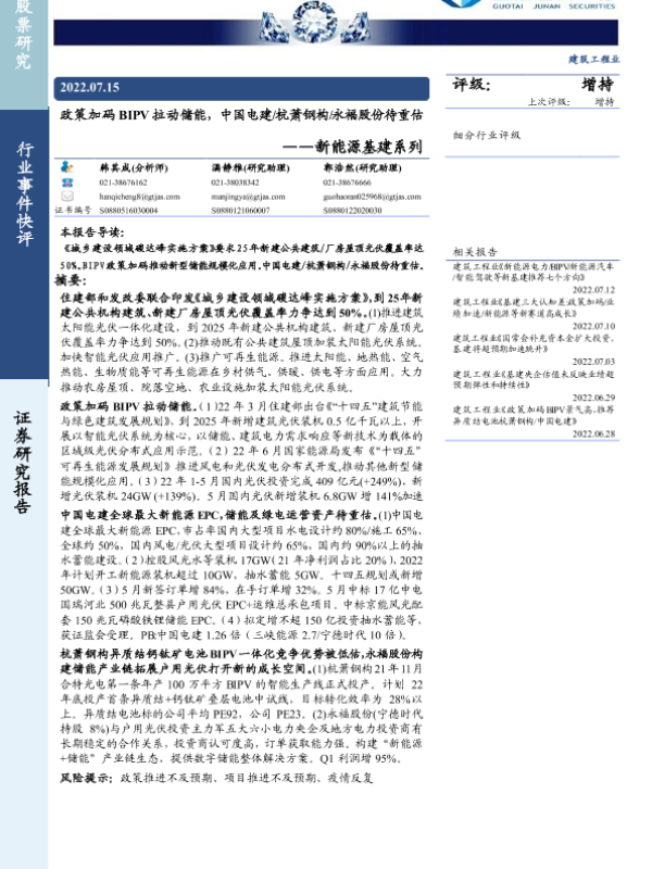 【国泰君安证券】【20220715】政策加码BIPV拉动储能,中国电建杭萧钢构永福股份待重估-23页