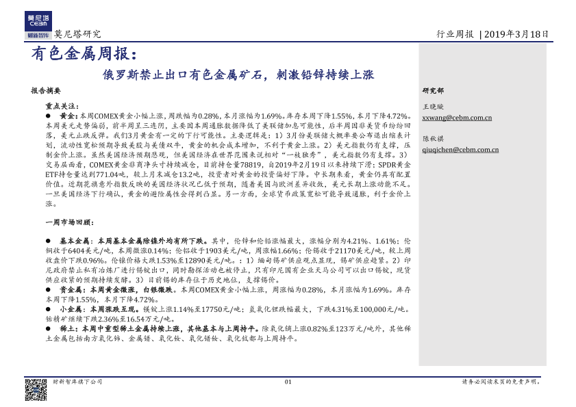 【莫尼塔研究】【20190318】20190318-莫尼塔投资-有色金属周报:俄罗斯禁止出口有色金属矿石,刺激铅锌持续上涨-16页