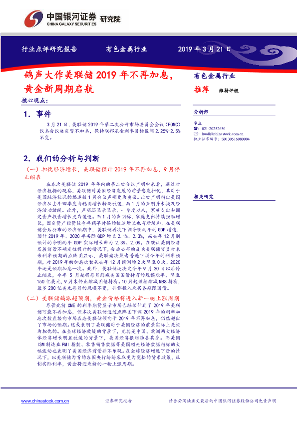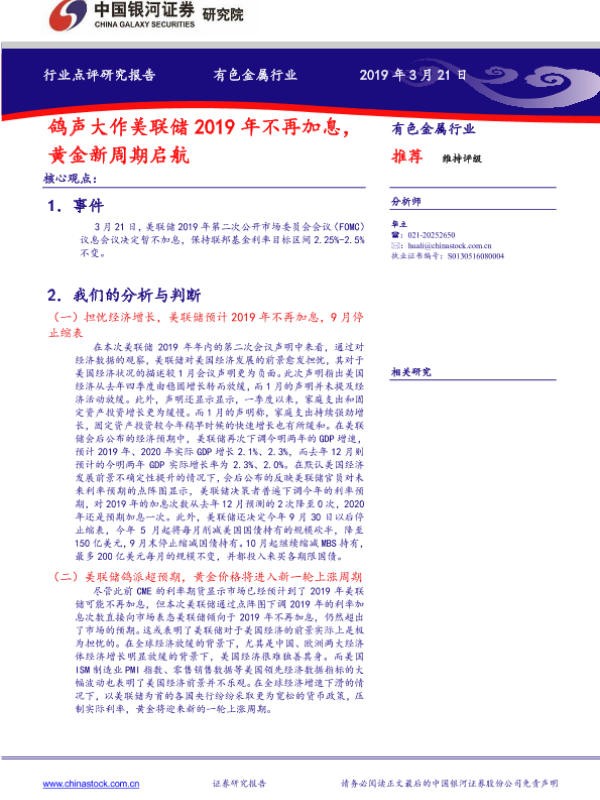 【银河证券】【20190321】有色金属行业:鸽声大作美联储2019年不再加息黄金新周期启航-4页