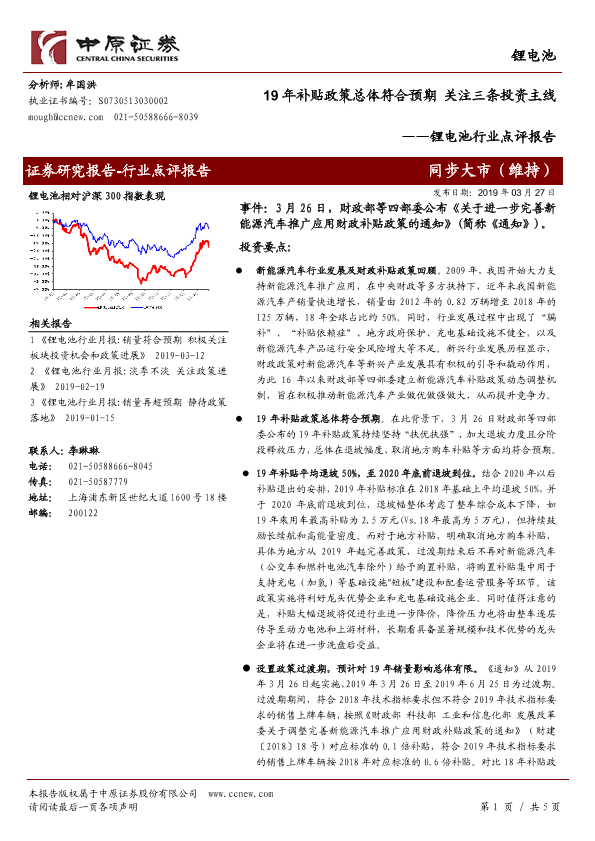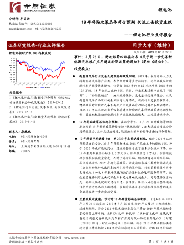 【中原证券】【20190327】20190327-中原证券-锂电池行业点评报告:19年补贴政策总体符合预期 关注三条投资主线-5页