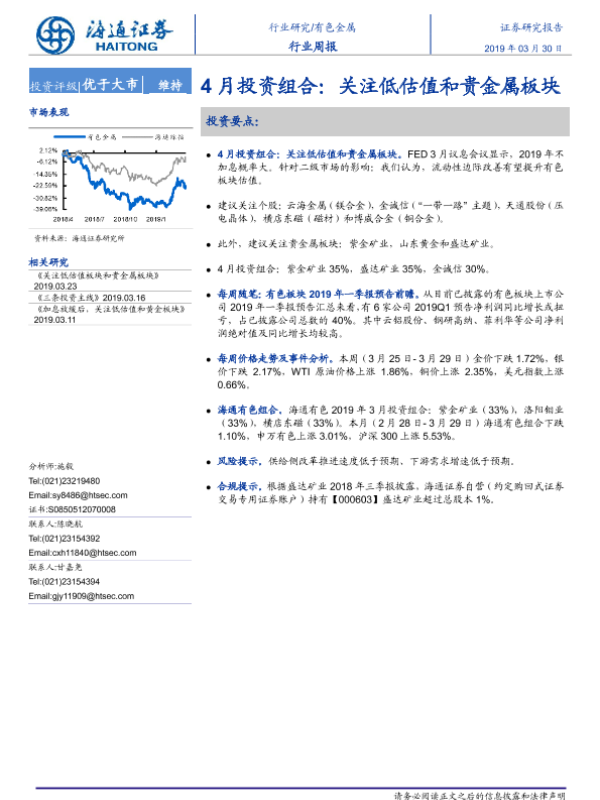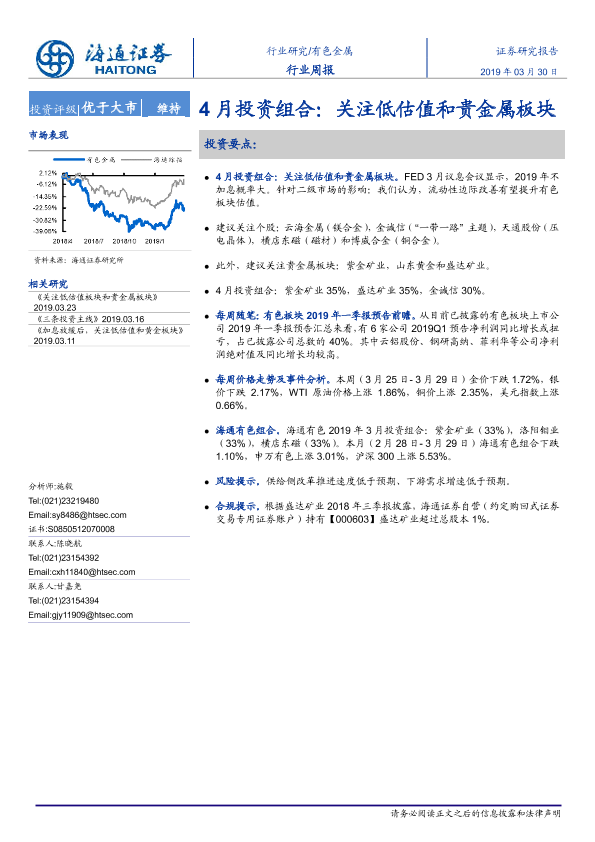 【海通证券】【20190330】20190330-海通证券-有色金属行业周报:4月投资组合:关注低估值和贵金属板块-9页