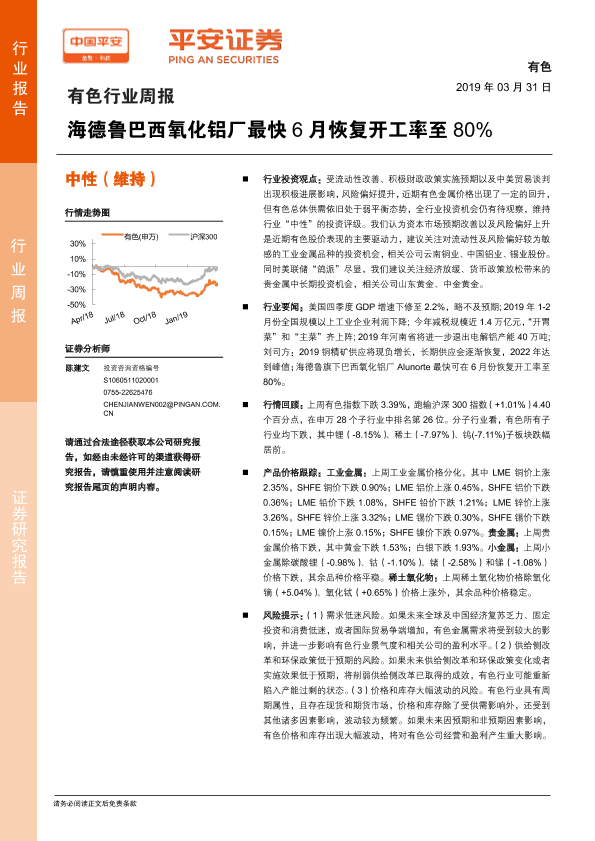 【平安证券】【20190331】20190331-平安证券-有色行业周报:海德鲁巴西氧化铝厂最快6月恢复开工率至80%-5页