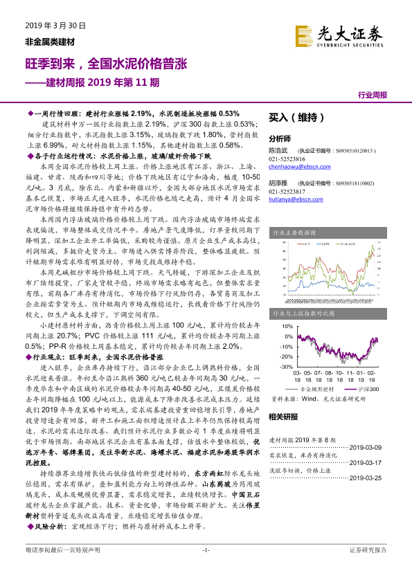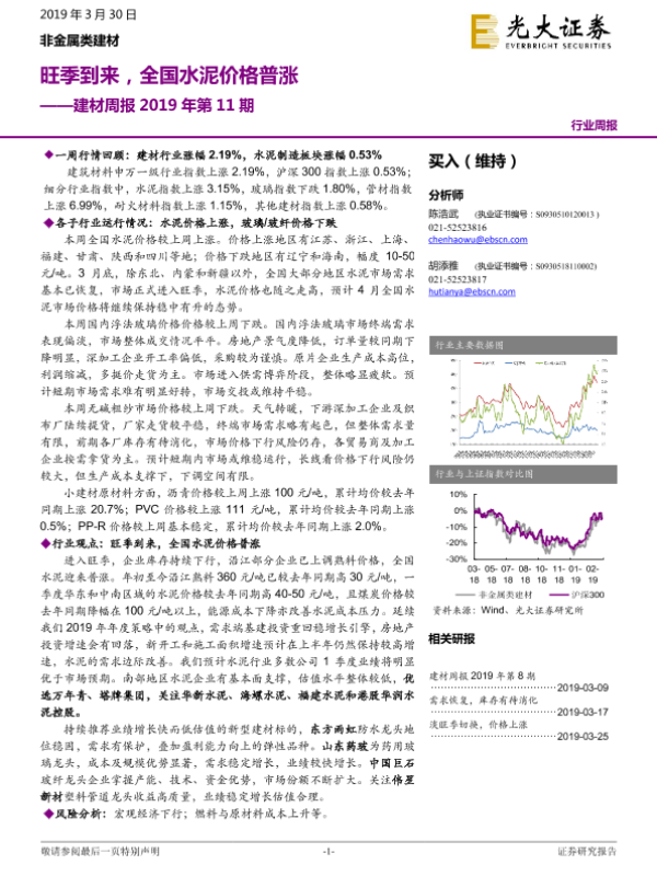 【光大证券】【20190330】20190330-光大证券-非金属类建材周报2019年第11期:旺季到来,全国水泥价格普涨-16页