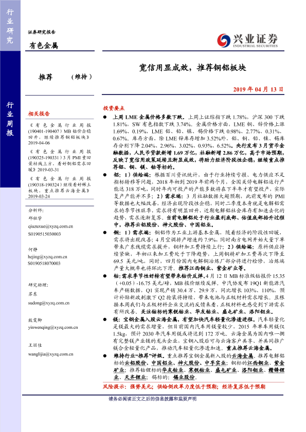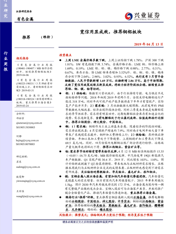 【兴业证券】【20190413】20190413-兴业证券-有色金属行业周报:宽信用显成效,推荐铜铝板块-11页