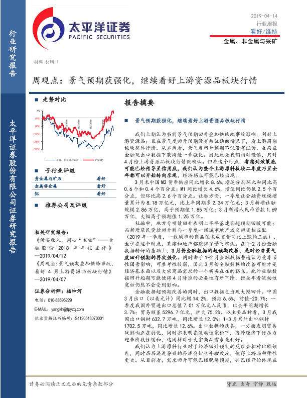 【太平洋证券】【20190414】20190414-太平洋-金属、非金属与采矿周观点:景气预期获强化,继续看好上游资源品板块行情-4页