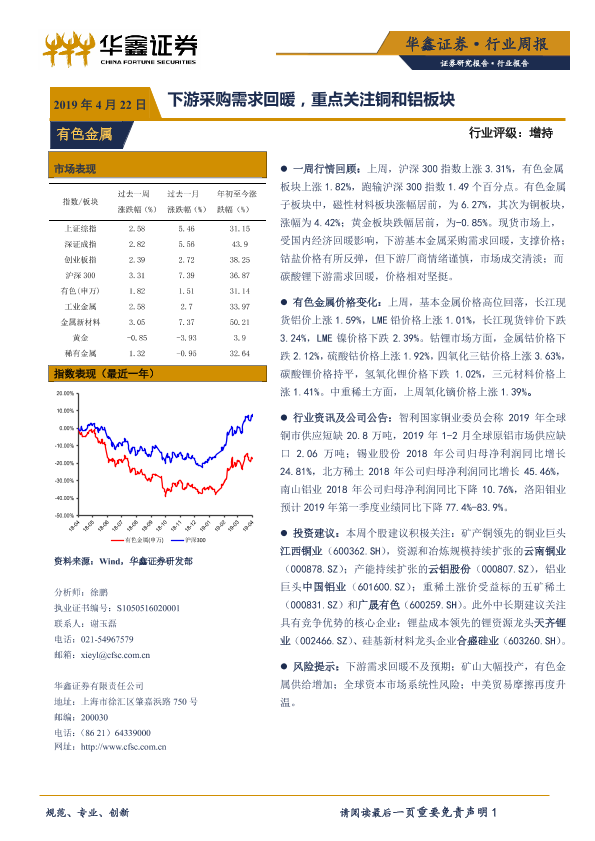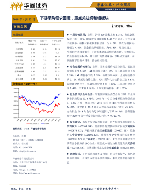 【华鑫证券】【20190422】20190422-华鑫证券-有色金属行业周报:下游采购需求回暖,重点关注铜和铝板块-13页