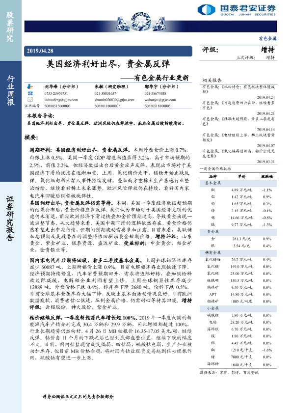 【国泰君安证券】【20190428】美国经济利好出尽,贵金属反弹——有色金属行业更新-14页
