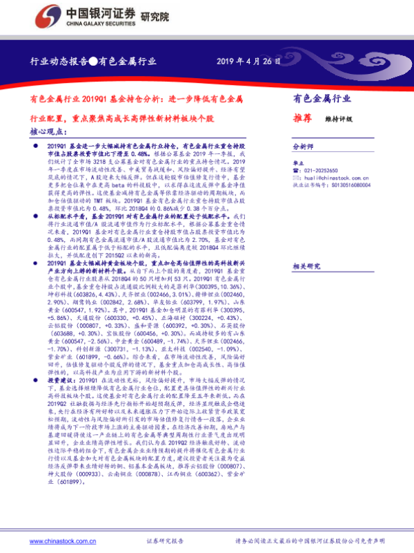 【银河证券】【20190426】有色金属行业2019Q1基金持仓分析:进一步降低有色金属行业配置,重点聚焦高成长高弹性新材料板块个股-13页