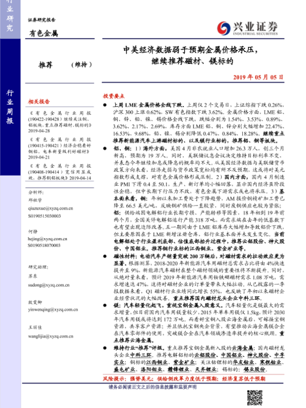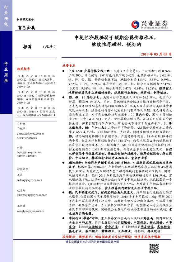【兴业证券】【20190505】20190505-兴业证券-有色金属行业周报:中美经济数据弱于预期金属价格承压,继续推荐磁材、镁标的-11页