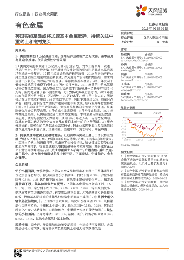 【天风证券】【20190505】20190505-天风证券-有色金属行业研究周报:美国实施基建或将加速基本金属反弹,持续关注中重稀土和磁材龙头-13页