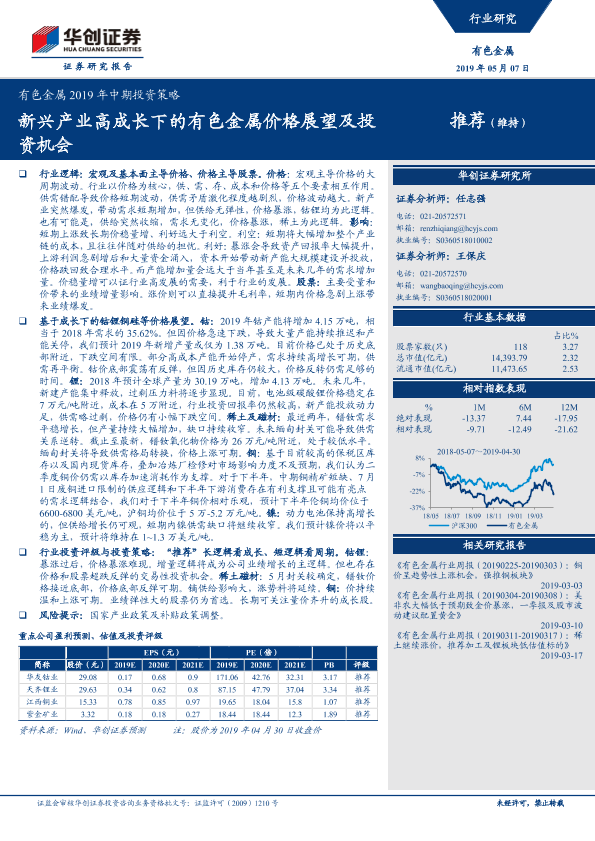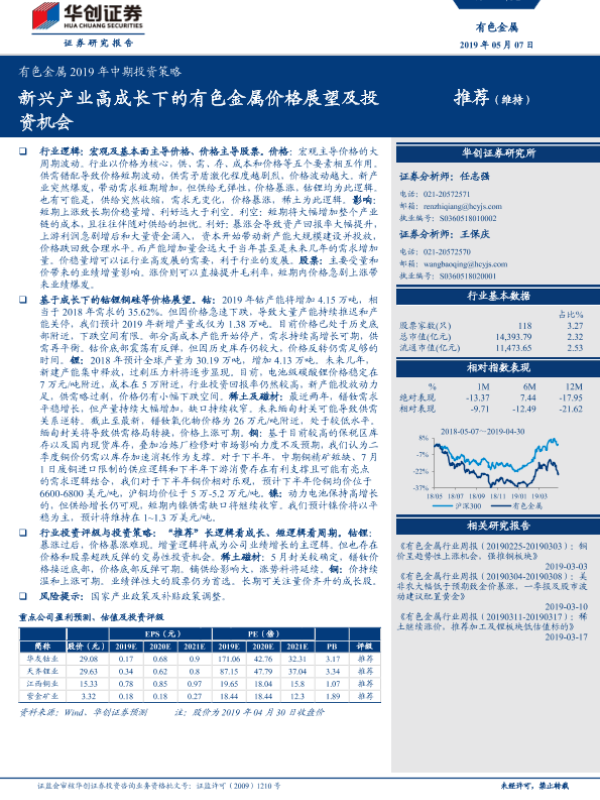 【华创证券】【20190507】有色金属2019年中期投资策略:新兴产业高成长下的有色金属价格展望及投资机会-20页