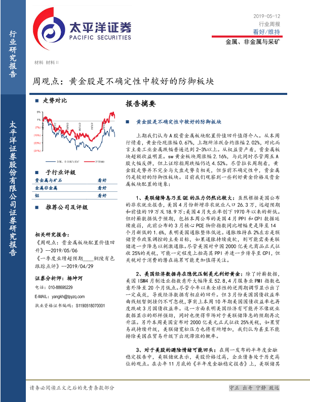 【太平洋证券】【20190512】20190512-太平洋-金属、非金属与采矿周观点:黄金股是不确定性中较好的防御板块-4页