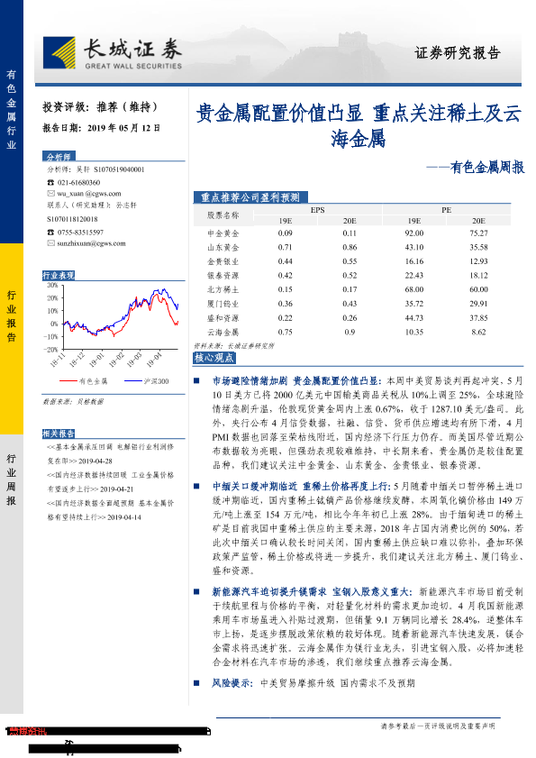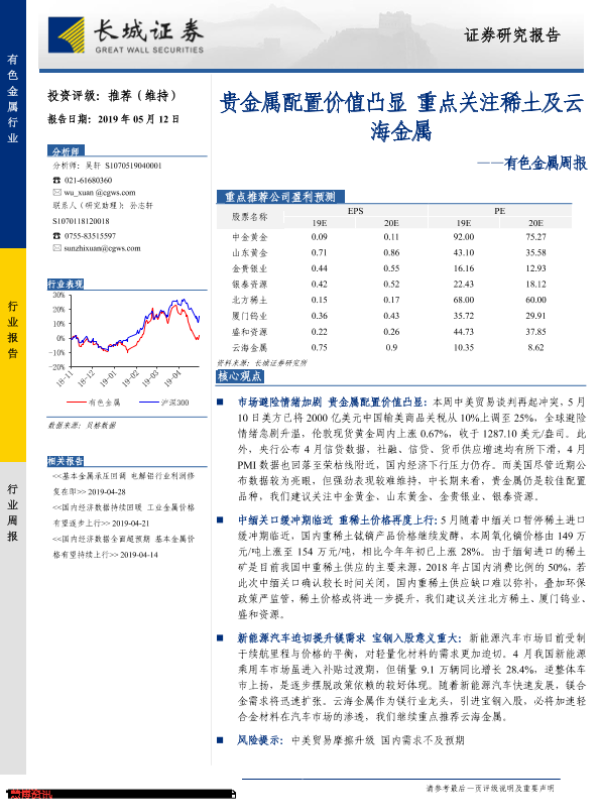 【长城证券】【20190512】20190512-长城证券-有色金属周报:贵金属配置价值凸显 重点关注稀土及云海金属-11页