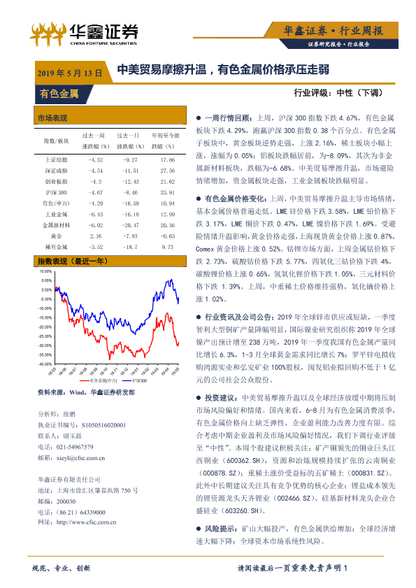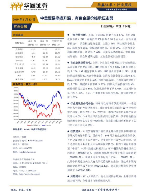 【华鑫证券】【20190513】20190513-华鑫证券-有色金属行业周报:中美贸易摩擦升温,有色金属价格承压走弱-12页