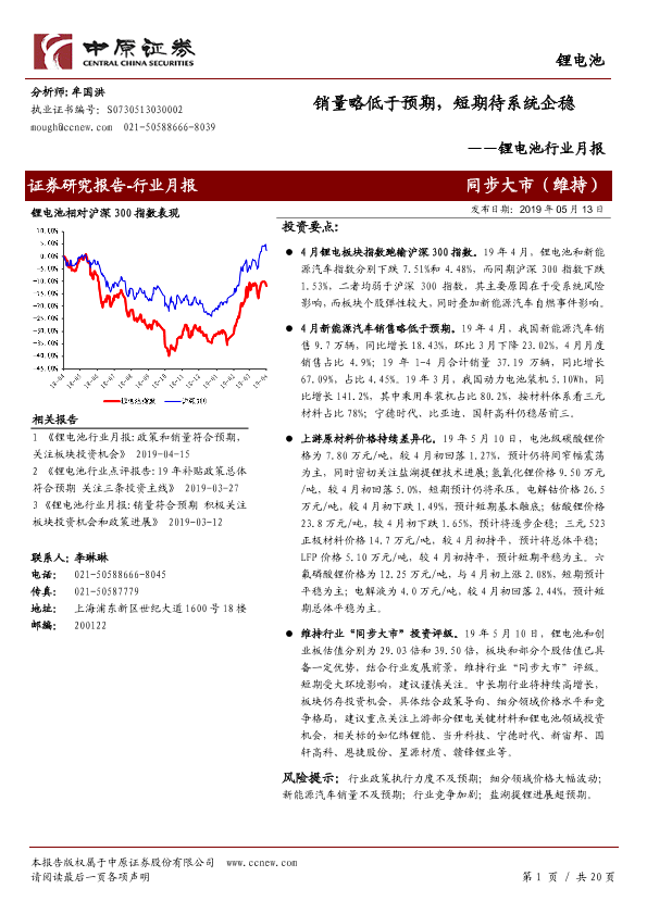 【中原证券】【20190513】锂电池行业月报:销量略低于预期,短期待系统企稳-20页