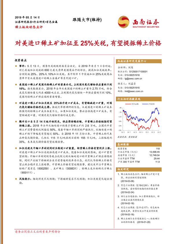 【西南证券】【20190514】稀土板块动态点评:对美进口稀土矿加征至25%关税,有望提振稀土价格-3页