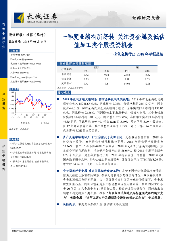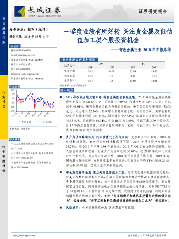 【长城证券】【20190514】20190514-长城证券-有色金属行业2018年年报总结:一季度业绩有所好转 关注贵金属及低估值加工类个股投资机会-25页