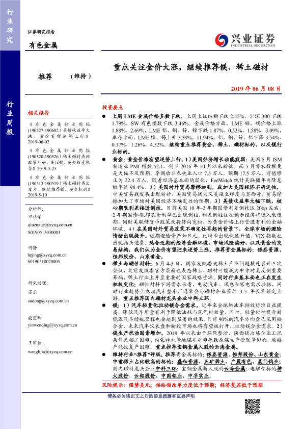 【兴业证券】【20190608】20190608-兴业证券-有色金属行业周报:重点关注金价大涨,继续推荐镁、稀土磁材-11页