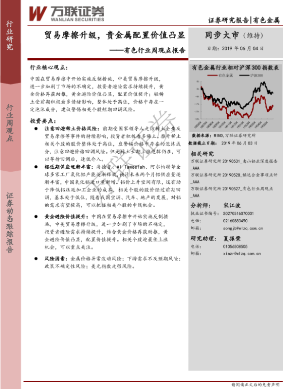 【万联证券】【20190604】20190604-万联证券-有色行业周观点报告:贸易摩擦升级,贵金属配置价值凸显-13页