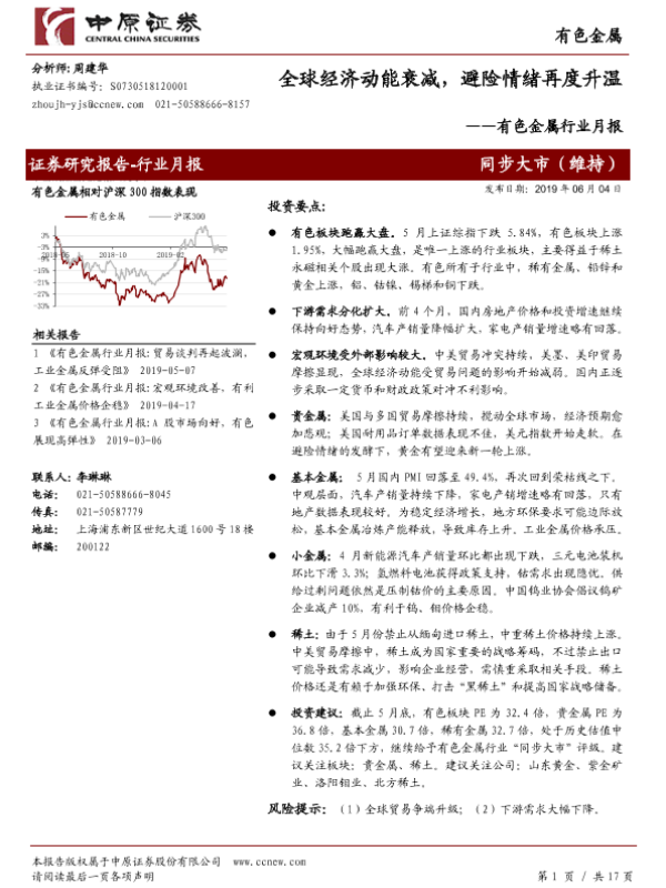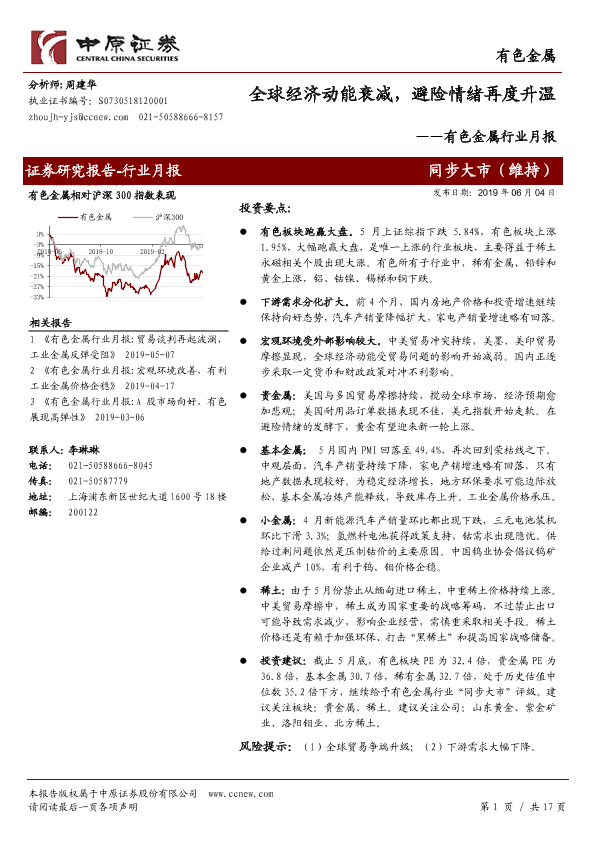 【中原证券】【20190604】20190604-中原证券-有色金属行业月报:全球经济动能衰减,避险情绪再度升温-17页