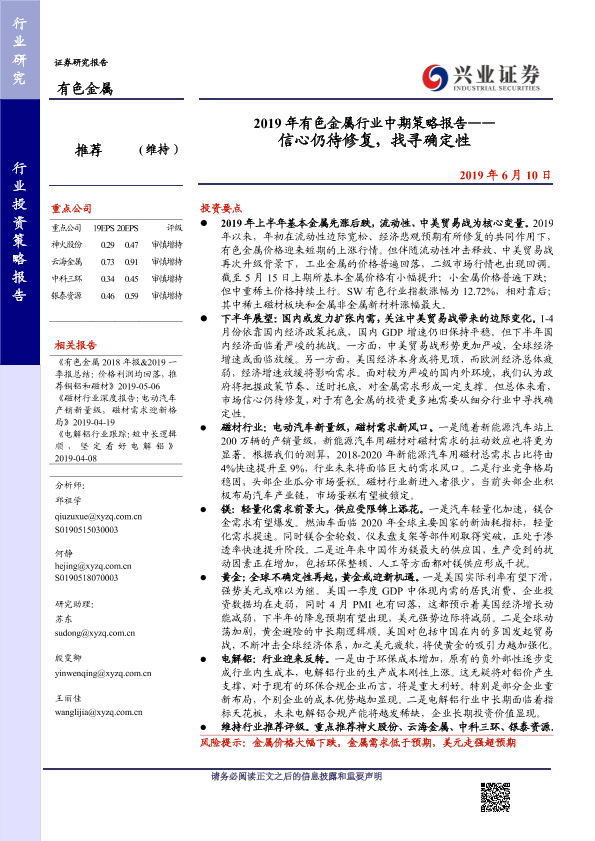 【兴业证券】【20190610】2019年有色金属行业中期策略报告——信心仍待修复,找寻确定性-48页