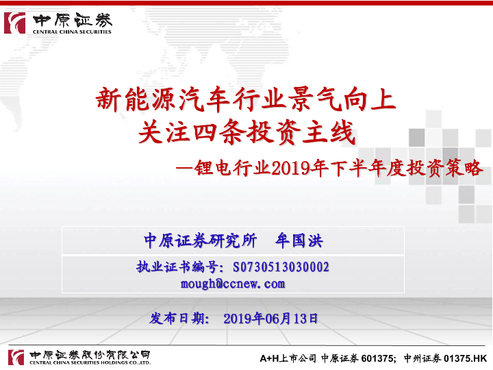 【中原证券】【20190613】锂电行业2019年下半年度投资策略:新能源汽车行业景气向上 关注四条投资主线-48页