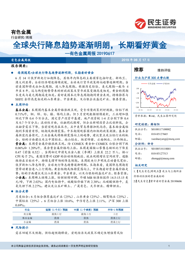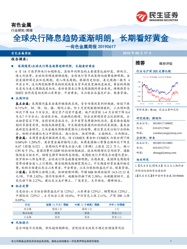 【民生证券】【20190617】20190617-民生证券-有色金属周报:全球央行降息趋势逐渐明朗,长期看好黄金-31页