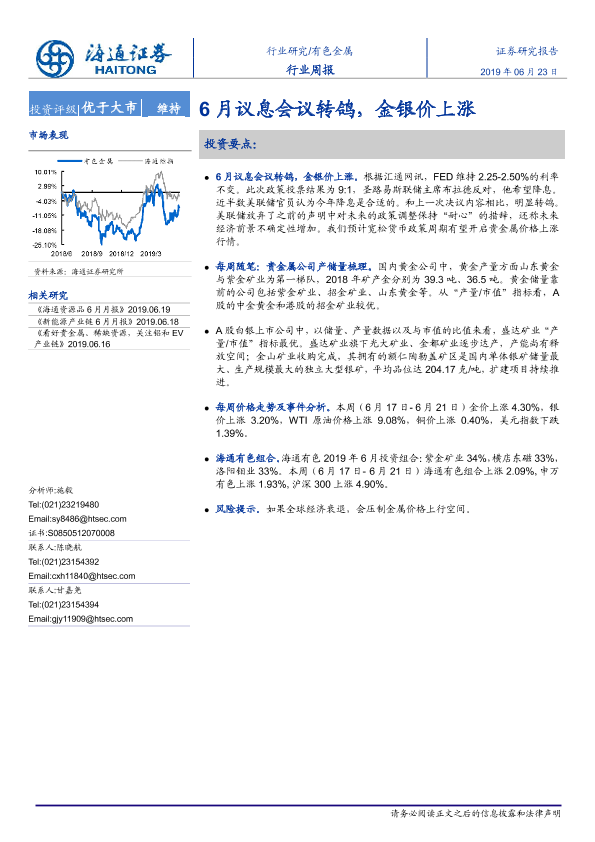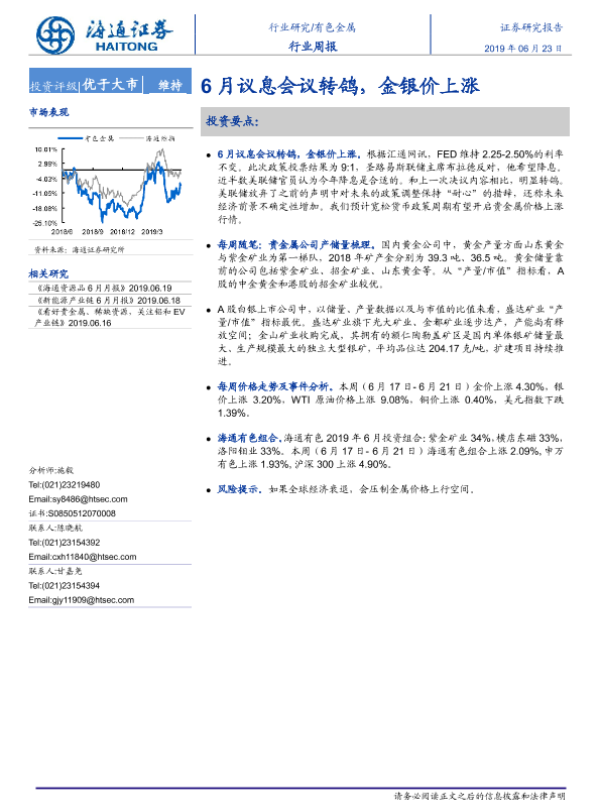 【海通证券】【20190623】20190623-海通证券-有色金属行业周报:6月议息会议转鸽,金银价上涨-9页