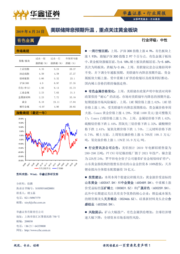 【华鑫证券】【20190624】20190624-华鑫证券-有色金属行业周报:美联储降息预期升温,重点关注黄金板块-12页