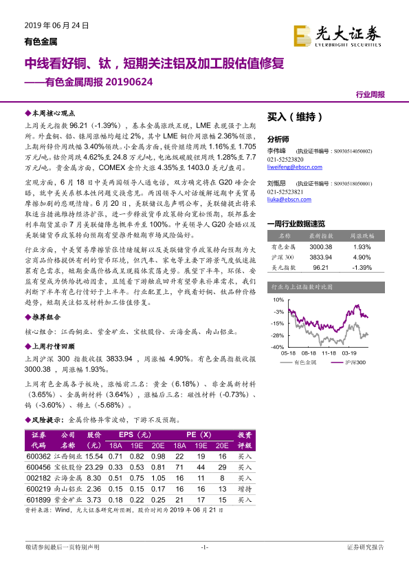 【光大证券】【20190624】20190624-光大证券-有色金属周报:中线看好铜、钛,短期关注铝及加工股估值修复-13页
