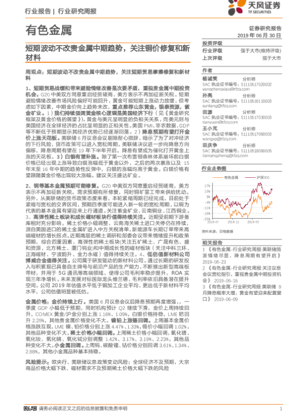 【天风证券】【20190630】20190630-天风证券-有色金属行业研究周报:短期波动不改贵金属中期趋势,关注铜价修复和新材料-15页