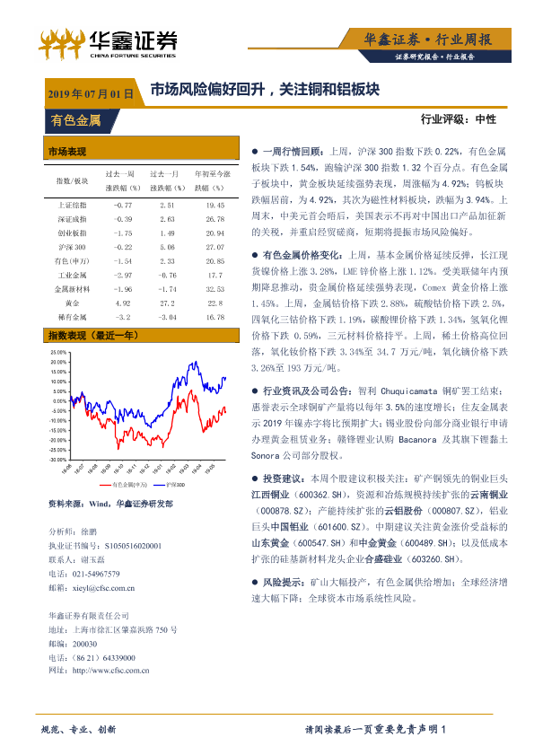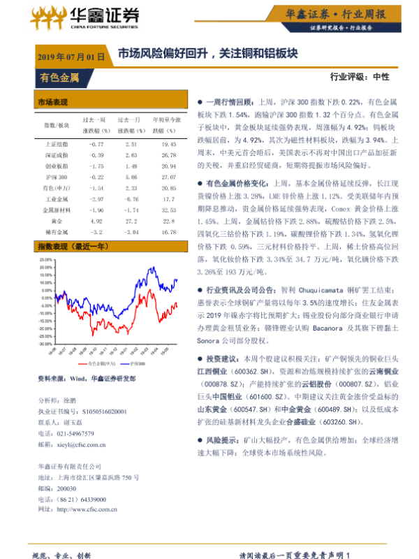 【华鑫证券】【20190701】20190701-华鑫证券-有色金属行业周报:市场风险偏好回升,关注铜和铝板块-12页