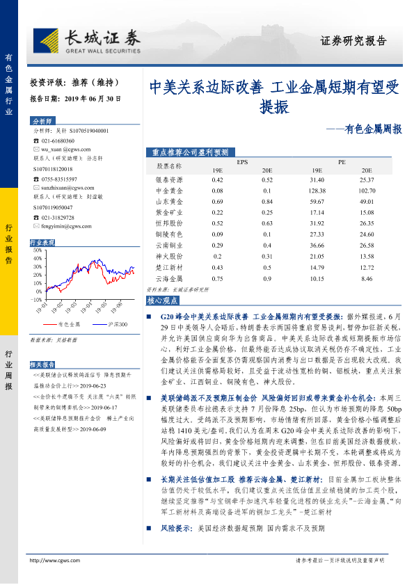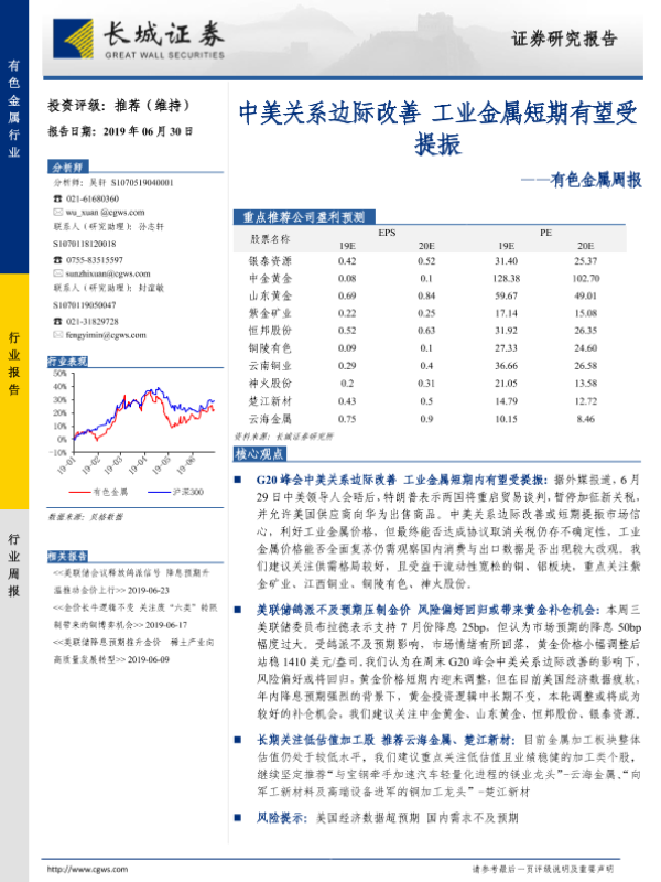 【长城证券】【20190630】20190630-长城证券-有色金属周报:中美关系边际改善 工业金属短期有望受提振-11页