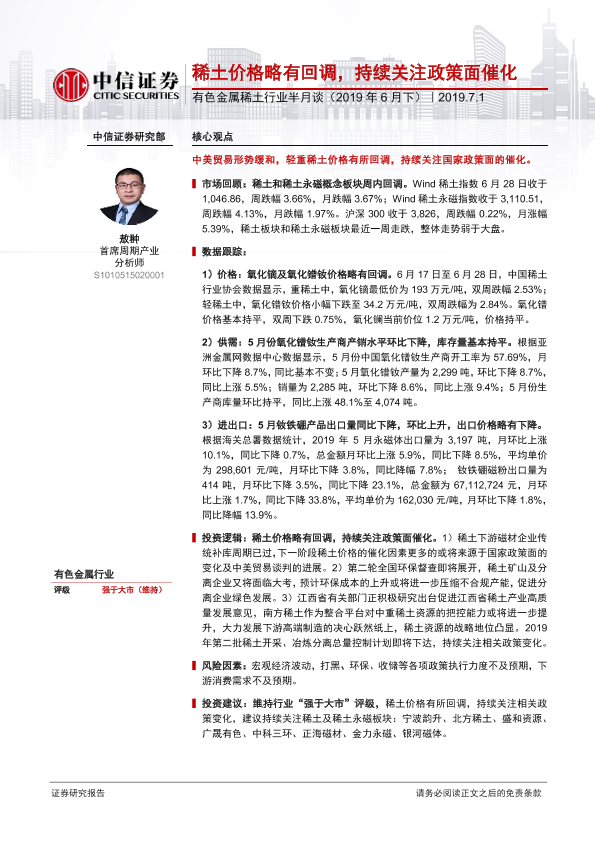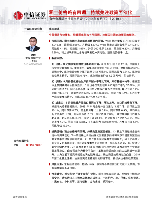 【中信证券】【20190701】有色金属稀土行业半月谈(2019年6月下):稀土价格略有回调,持续关注政策面催化-29页