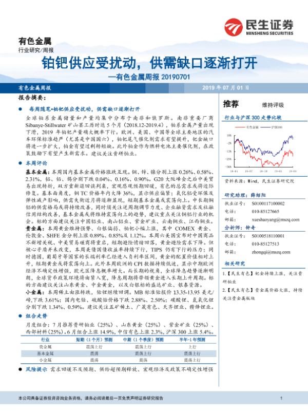 【民生证券】【20190701】20190701-民生证券-有色金属周报:铂钯供应受扰动,供需缺口逐渐打开-31页