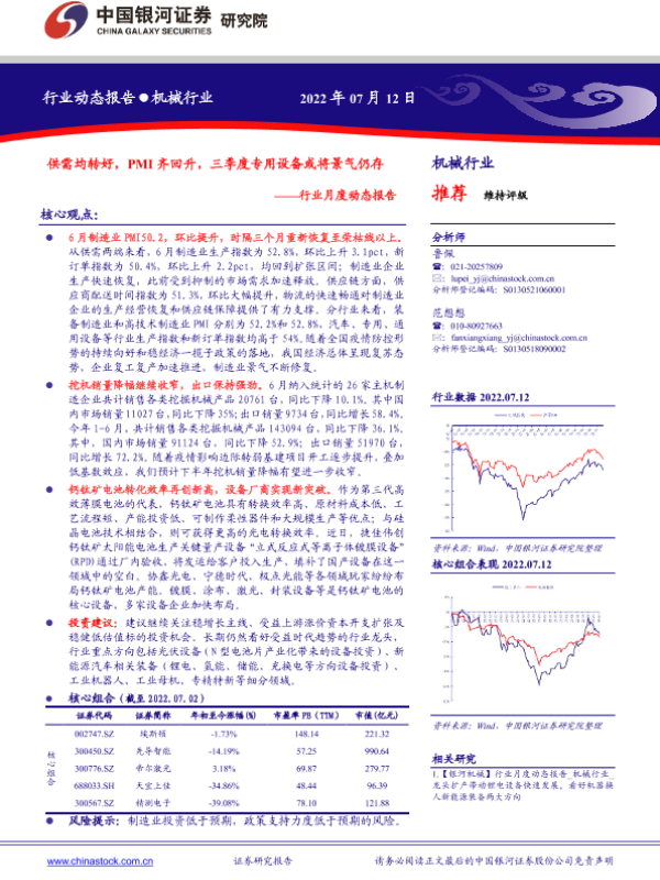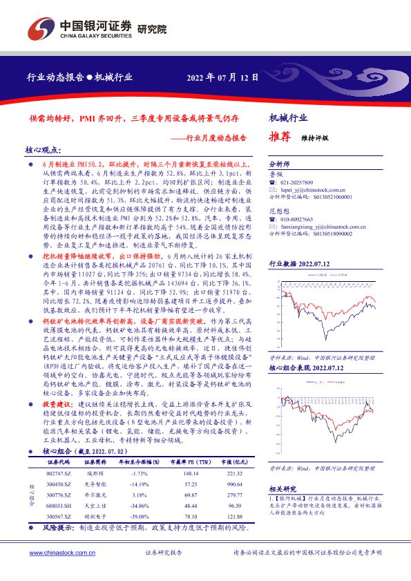 【银河证券】【20220712】机械行业月度动态报告:供需均转好,PMI齐回升,三季度专用设备或将景气仍存-30页